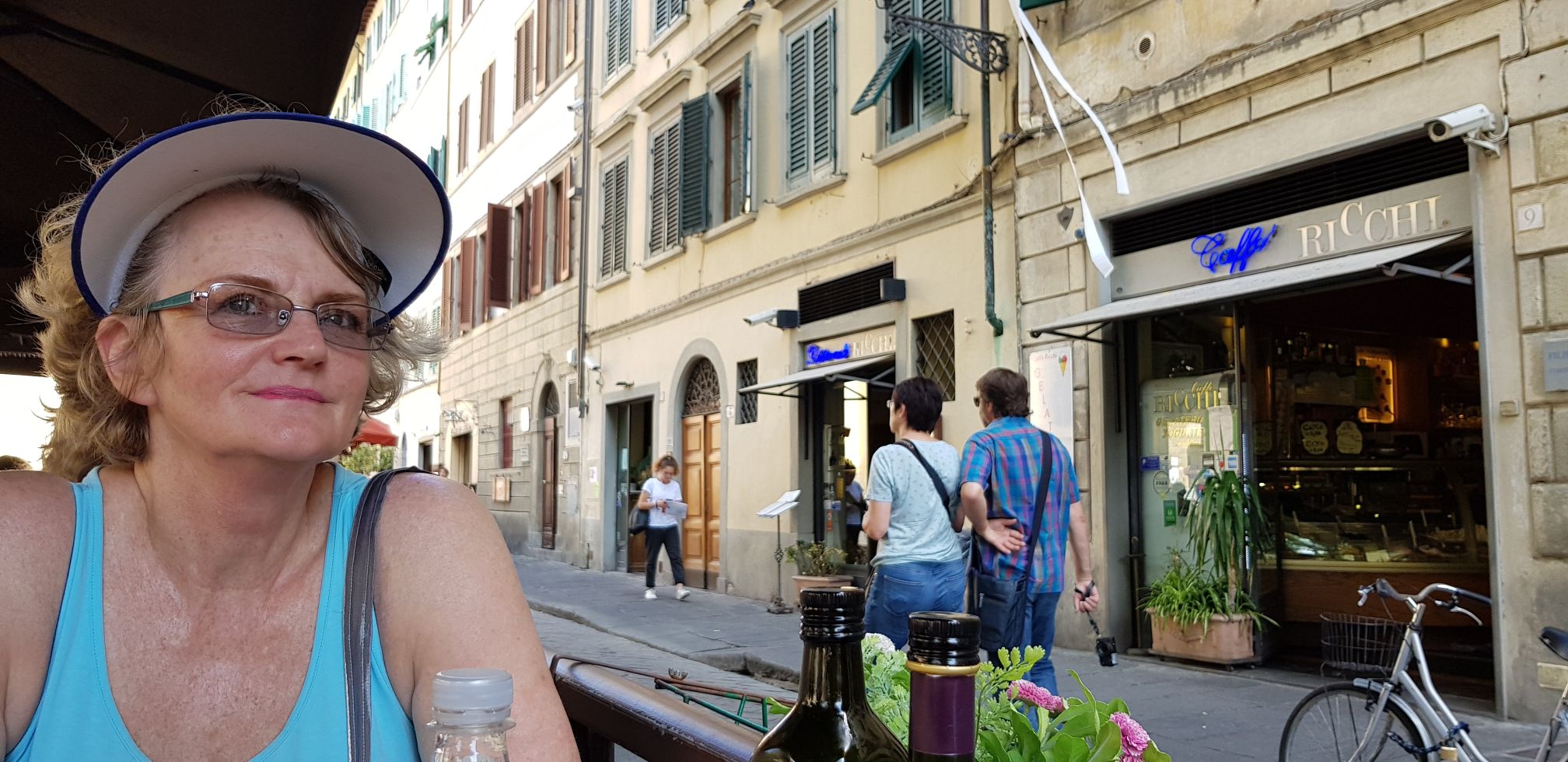 Van die stasie waar die bus stop stap ons in die bloedige hitte met ons swaar tasse na ons AirBnB. Ons kry dit gelukkig maklik genoeg. ʼn Woonstel op die Arno rivier in die Oltrarno kunstenaarsbuurt. Ons sit ons tasse neer besluit om die buurt waar ons bly te gaan verken. Ons gaan soek ʼn plekkie om te eet op die Santo Spirito Square. En ons skrik ons dood vir die pryse (!). Later sou ons agterkom Florence is nou maar net so duur. Ek het die plattelandse pryse in my kop gehad, baie goedkoper. Florence is natuurlik ʼn baie gewilde toeriste bestemming.