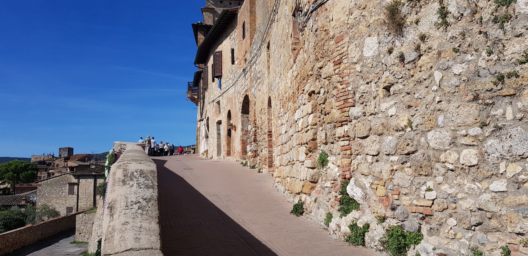 Nadat almal soos sardientjies in die twee dubbeldekkerbusse gelaai is vertrek ons na San Gimignano. En dit was werklik so asemrowend soos die prentjie op Pinterest belowe. San Gimignano is as ʼn UNESCO wêrelderfenisterrein verklaar omdat dit so behoue voorbeeld van ʼn Middeleeuse dorpie is. Ons het twee ure of so gehad om die dorpie te verken en ek en Mam besluit om eers net te sit en ʼn cappuccino te drink en die atmosfeer in te slurp. Van daar loop ons deur die strate, oor die stadsmure en verkyk ons aan alles. By ʼn klein leerwinkel koop ek vir myself uiteindelik my leerhandsak. Dit iss duur, maar ek wou nie by die mark net enige iets koop nie. Ons neem foto’s in winkeldeure en voor die stadsplein se fontein. (As ek nou terugdink besef ek ons moes daai dag al baie moeg gewees het van die vorige dag se heeldag stap (deur Florence) en indrukke.)