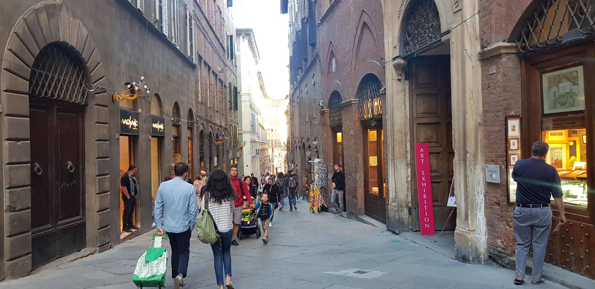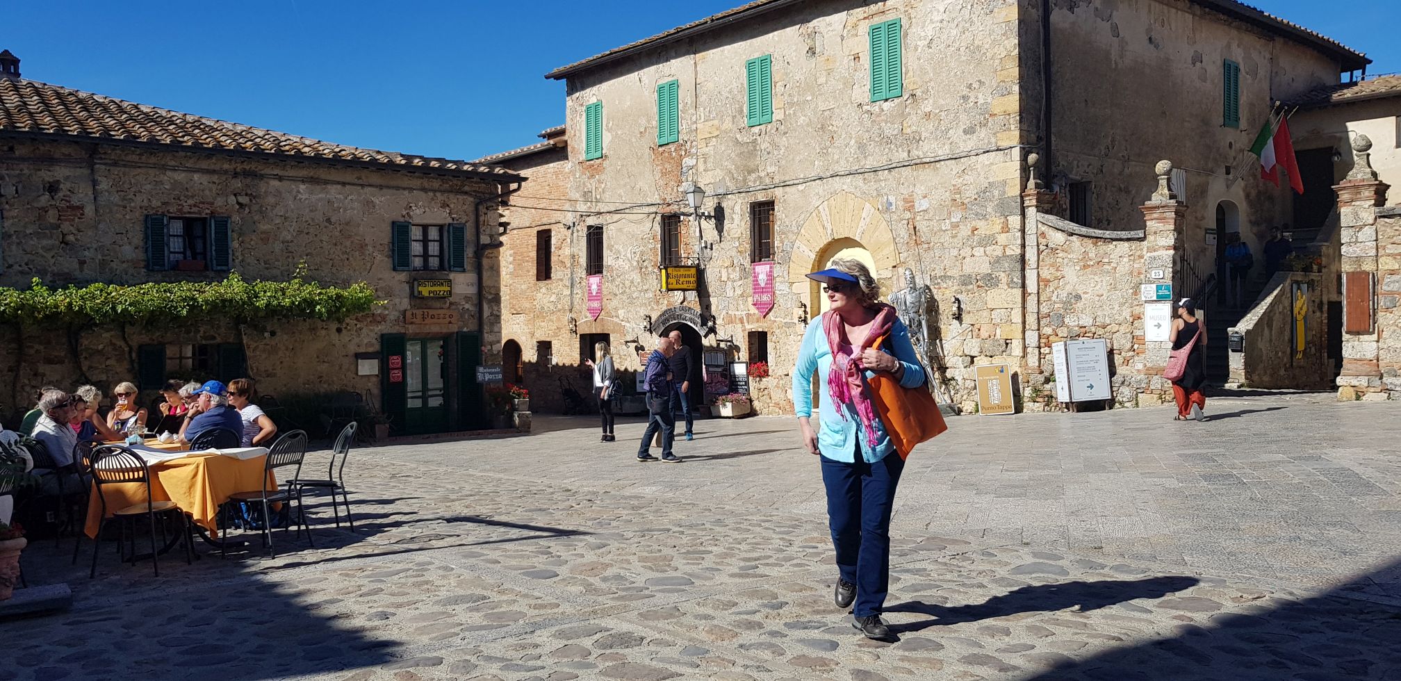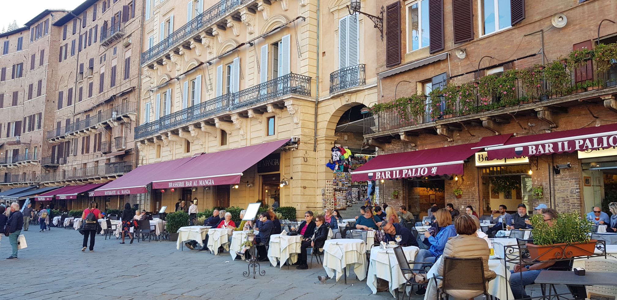 Soveel indrukke in een dag en nog was dit die einde nie… Die groot stad Siënna lê nog voor. Jy kon ʼn selfbegeleide toer doen met oorfone en begeleiding wat die toermaatskappy verskaf, maar ons het besluit om dit rustig te vat. Ons het die stad te voet verken en uiteindelik in groot plein gaan sit en (rooibos)tee en wyn drink. My ma vra die kelner of hulle rooibostee op die spyskaart het. Toe hy sê nee sê sy oukei, bring maar net vir my kookwater, en haal haar eie rooibostee uit haar handsak.